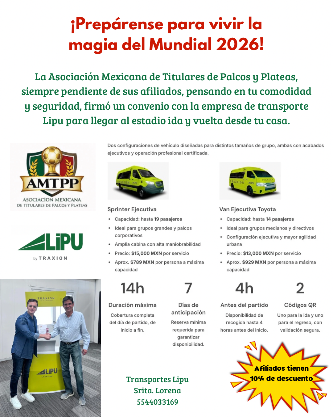 La Asociación Mexicana de Titulares de Palcos y Plateas (AMTPP) nace para defender los derechos de propiedad y acceso de nuestros afiliados para el mundial 2026. Somos la voz unida que exige el cumplimiento irrestricto de los beneficios establecidos en sus títulos de propiedad, mientras construimos una comunidad sólida.
